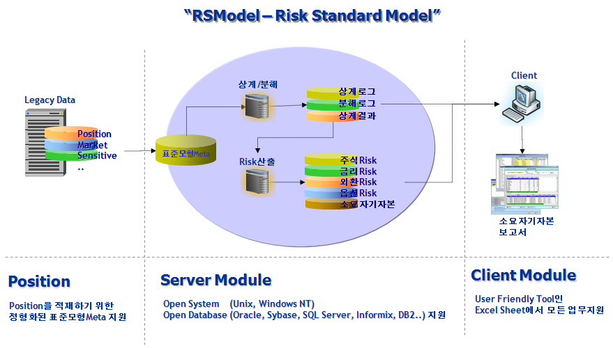 RSModel은 바젤위원회에서 제시하는 표준모형 방법론을 패키지화한 시스템으로 정교한 상계 및 분해 로직과 요인별 리스크 산출로직이 포함되어 있어 표준모형을 이용한 소요자기자본 산출의 모든 업무를 처리할 수 있으며 인터페이스 받은 원천 데이터 부터 소요자기자본 산출까지 발생하는 모든 로그와 산식 및 결과를 검증할 수 있도록 분석 시스템과 연동되는 검증시트를 제공함으로써 사용자가 소요자기자본 산출에 관련된 데이터흐름을 일목요연 하게 파악할 수 있어 업무에 대한 이해와 외부의 다양한 요구에 효율적으로 대처할 수 있도록 구축된 시스템.